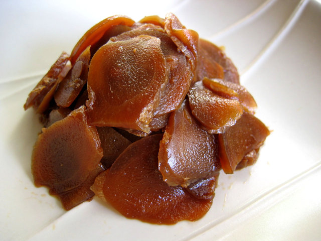 久しぶりに、「しょうがの佃煮」を作ってみました。 これは、私の義姉から教わったものですが、 最近はすっかり忘れていて、ホントに久しぶりに作りました。 作り方はとても簡単で、 要するに、薄切りのしょうがを、醤油と砂糖で煮込むというだけの事なんですけど、 水と醤油の割合とか、赤酒をちょっと入れてみたりとか、 そこに、長年生きてきた主婦の知恵が注ぎ込まれるワケなのですよ。 長年生きているのも、ムダではないのですねえ・・・(*^-^*) あ、そうだ、一つだけ大事な事は、新ショウガを使う事です。 古ショウガで作ったら、何時間煮ても、全然柔らかく煮えないと思います。 以前失敗して、学習済みです。(^^;)