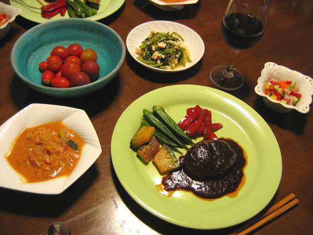 付け合せなどは、前日に下ごしらえをしておいて、今日は炒めるだけ。 物産館から買ってきた、新鮮なミニトマト3種類は、洗っただけ。 それに、昨日のおかずの残りも並べて、何だか賑やか! とにかく、お休みの火曜日は、「工程はシンプル」に「食べるのはたっぷりと」v(^^)