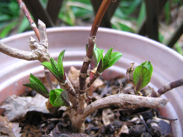 この紫陽花は、“華麗亭・紫陽花ガーデン化計画”の一役を担う予定の、一鉢だ。 挿し木をして育てているのだけど、 昨年の猛暑、そして、この冬の厳しい寒さを、何とか乗り越え、新しい芽を出している。